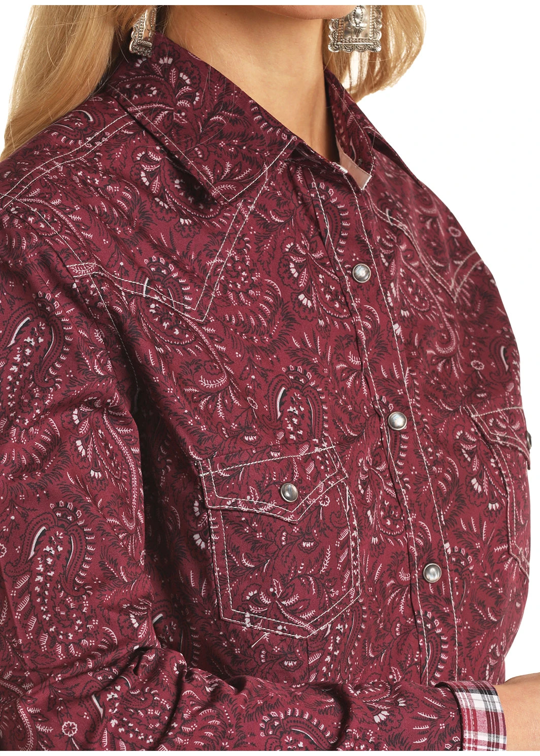 Burgundy Feathered Paisley Print Long Sleeve Snap Front Shirt.