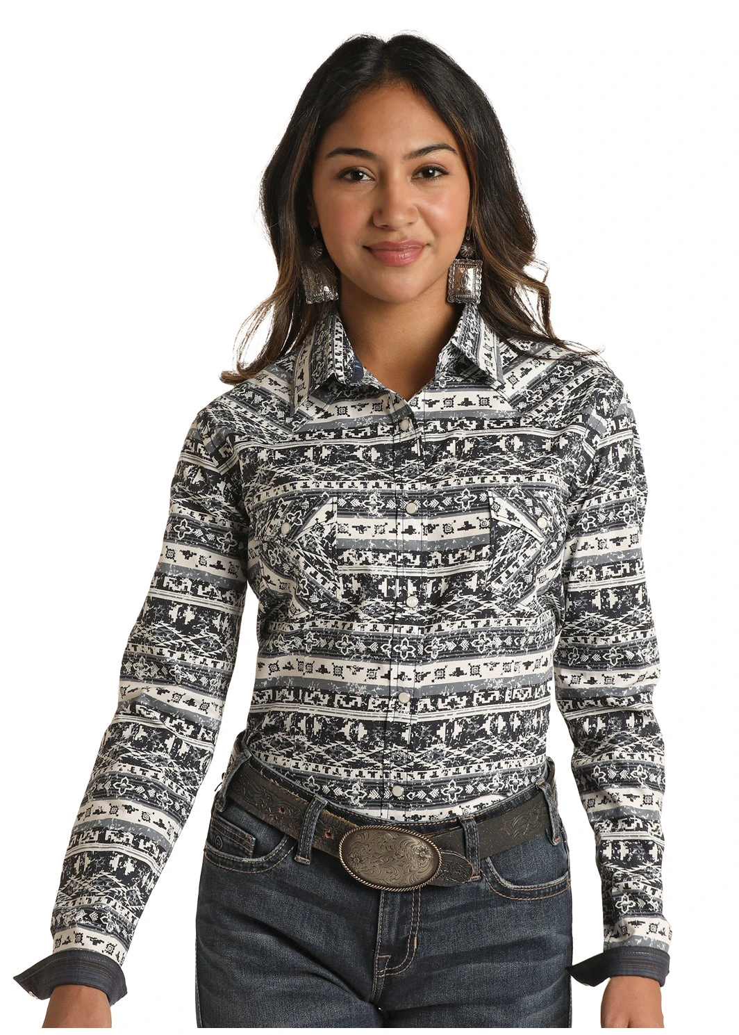 Grey and White Aztec Stripe Long Sleeve Snap Front Shirt.