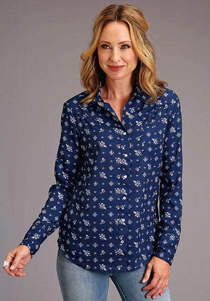 Blue and White Vintage Ditzy Print Long Sleeve Snap Front Shirt.