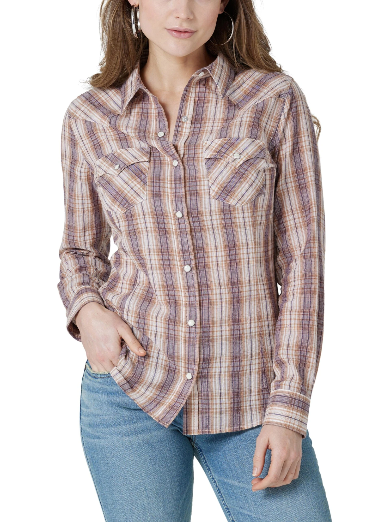 Pink Mauve Plaid Long Sleeve Snap Front Shirt.